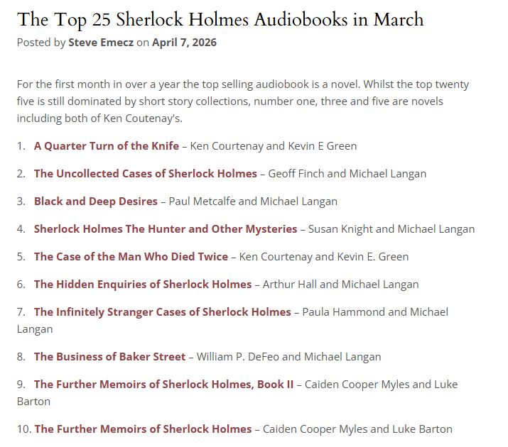 Very pleased to find the audiobook of my novel is Number 3 in the Top 25 MX audiobooks on the Audible platform for March. My first book (The Case of the Australian Atlases) is still Number 12 after six months too! Well done also to my fellow MX author Ken Courtenay for having two books in the Top 10, including Number 1.